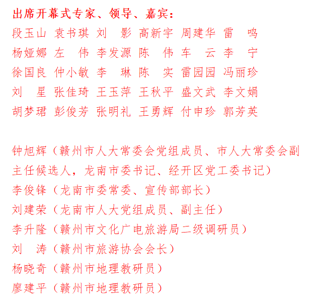 开幕式上,龙南市委书记、经开区党工委书记钟旭辉,中国教育学会地理教学专委会理事长段玉山,《中国国家地理》杂志社发行公司总经理李宁,江西省地理学会秘书长刘影,专家代表袁书琪先后致辞,南京师范大学刘南希同学作为参赛代表发言。开幕式最后,主办单位向承办单位赠送了纪念品。开幕式结束后,全体人员合影留念。